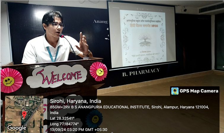 अनंगपुरिया स्कूल ऑफ़ फ़ार्मास्यूटिकल साइंसेज़, आलमपुर में १५ सितम्बर २०२५ को हिंदी दिवस बड़े हर्ष और उत्साह के साथ मनाया गया। विदित है कि १४ सितम्बर, १९४९ को संविधान सभा ने हिंदी को भारत की राजभाषा के रूप में स्वीकार किया था। इसी उपलक्ष्य में प्रतिवर्ष हिंदी दिवस मनाया जाता है। इस आयोजन का उद्देश्य विद्यार्थियों में हिंदी भाषा के प्रति सम्मान एवं गर्व की भावना उत्पन्न करना तथा हिंदी साहित्य एवं संस्कृति के महत्व को समझाना है।